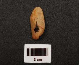 | Description / विवरण | An unmodified quartz pebble, broken on one side, smooth and uneven surface, |