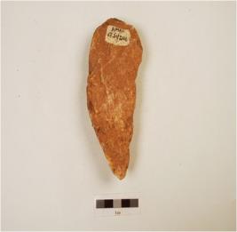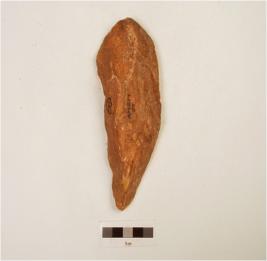 | Description / विवरण | A quartzite hand axe made on pebble, flake scars on the surface, cortex on surface, plano convex cross section, use wear marks on the cutting edges. |