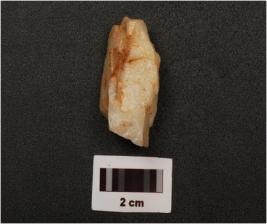 | Description / विवरण | Quartz core with prepared platform, five flake scars, diffused bulb on ventral side, use wear mark along cutting edges, |