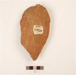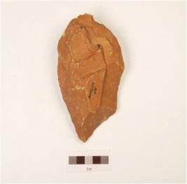 | Description / विवरण | A bifacial handaxe made on quartzite end struck flake with flake scars on both sides, prepared platform, wavy working edge and triangular in section. |