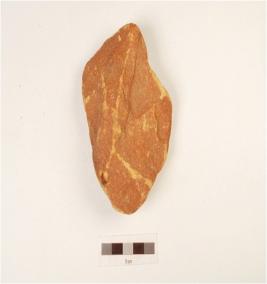 | Description / विवरण | A hand axe made on sandstone pebble, flake scars on both sides, biconvex section. |
