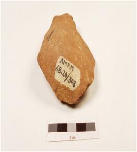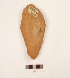 | Description / विवरण | A handaxe made on quartzite pebble with flake scars on ventral, cortex on dorsal and wavy working edge, plano-convex in section. |