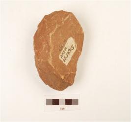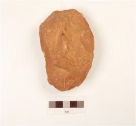 | Description / विवरण | A hand axe made on quartzite pebble, flake scars on both sides, biconvex section. |