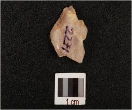 | Description / विवरण | A quartz flake with blade scars on the surface, and ruged surface, in irregular shaped and use wear marks along cutting edges, |