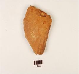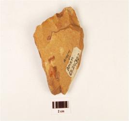 | Description / विवरण | A scraper made on quartzite end struck flake with flake scars on dorsal side, striking platform, bulb on ventral and use wear marks on working edge. |