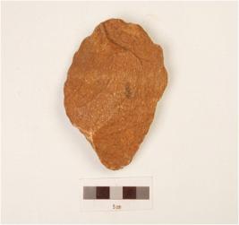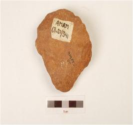 | Description / विवरण | A bifacial scraper, made on quartzite pebble with cortex on ventral, flake scars on dorsal and use wear marks on working edge. |
