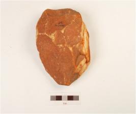 | Description / विवरण | A hand axe made on sandstone pebble, slightly chipped off edges, flake scars on both sides. |