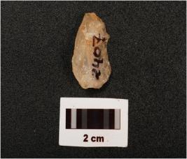 | Description / विवरण | Fragment of blade with flake scars on dorsal side, use-wear marks on working edge, diffused bulb on ventral side, prepared platform, |