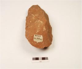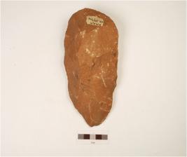 | Description / विवरण | A bifacial handaxe, made on quartzite flake with flake scars on both sides, use wear marks on working edge and plano-convex in section, thick butt end and pointed along other end. |
