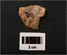 | Description / विवरण | Fragment of blade made with quartz prominent bulb on ventral side, use- wear marks on working edge, smooth surface, |