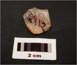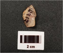 | Description / विवरण | Fragment of a blade made with quartz stone, use wear marks on working edge, prominent bulb on ventral side, flake scars on dorsal side, |