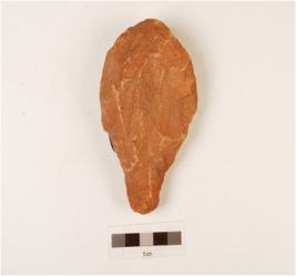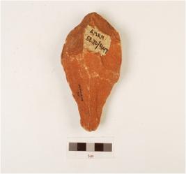 | Description / विवरण | A hand axe made on quartzite side struck flake, use wear edges, pointed end, flake scars on surface, biconvex in section. |