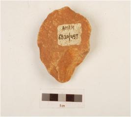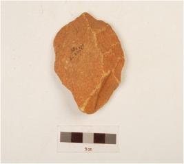 | Description / विवरण | A bifacial scraper made on quartzite end struck flake with striking platform, flake scars on both sides and use wear marks on working edge, triangular in section. |