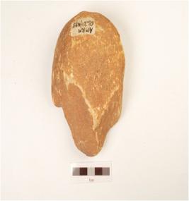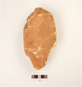 | Description / विवरण | A hand axe made on quartzite pebble, cortex visible at butt end, plano convex section. |