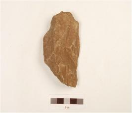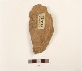 | Description / विवरण | Side scraper on flake, side struck, striking platform on side with positive bulbon ventral side, retouches visible on working edges, flake scars on surface, triangular cross section. |