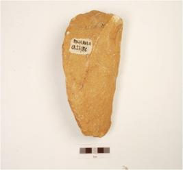 | Description / विवरण | Side scraper, end struck, flake scars visible on surface, retouches on working edge, striking platform on one end, diffused positive bulb, triangular cross section. |