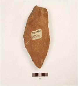 | Description / विवरण | Side scraper, end struck, positive bulb visible on one end with diffused bulb on ventral side, flake scar on one side, retouches visible on working edges, triangular cross section. |