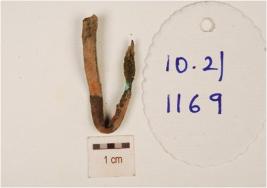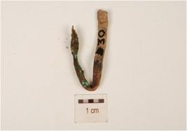 | Description / विवरण | Fragment of a copper nail with rectangular cross section and green coloured incrustration visible on the surface. |