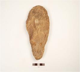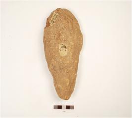 | Description / विवरण | Hand axe with a broad butt on one end and a pointed on other end, flakings visible on both sides, diamond shape cross section, made on nodule. |