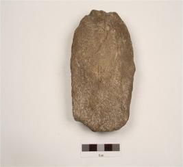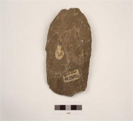 | Description / विवरण | A handaxe made on quartzite end struck flake, flake scars on ventral side, bulb of percussion on ventral surface, prepared platform proximal end with sharp wavy cutting edges, biconvex in section. |