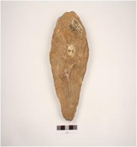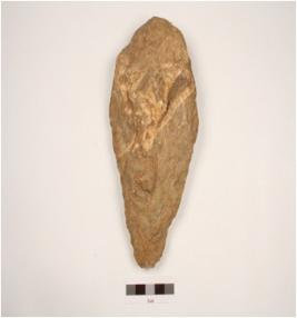 | Description / विवरण | A handaxe made on quartzite pebble, flake scars on both surface, pointed on anterior end, with sharp wavy cutting edges, biconvex in section. |