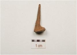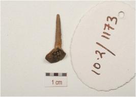 | Description / विवरण | A copper nail slightly circular head and pointed other end and circular in section. |