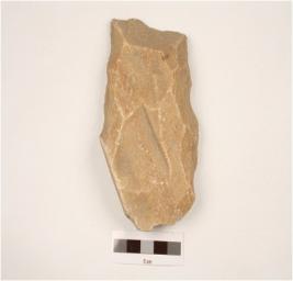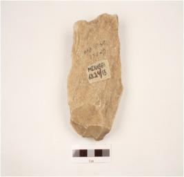 | Description / विवरण | A cleaver made on quartzite side struck flake with broade cutting edge, flake scars on one side, plano-convex in section. |