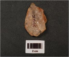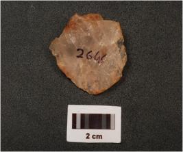 | Description / विवरण | A quartz flake with striking platform, diffused bulb on ventral side and use, wear marks on edges. |