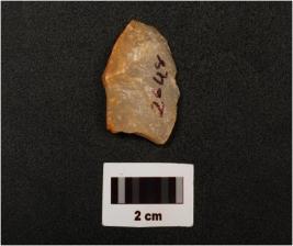| Description / विवरण | A quartz side struck flake with, striking platform, diffused bulb on ventral side, one edge is partly broken, slightly cortex visible and use, wear marks along cutting edges. |