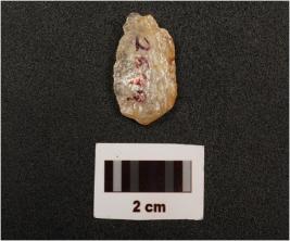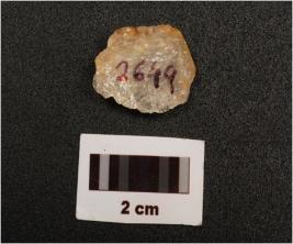 | Description / विवरण | Quartz end struck flake with striking platform, diffused bulb on ventral side, flake scars on dorsal side, slightly cortex visible and use, wear marks on edges |