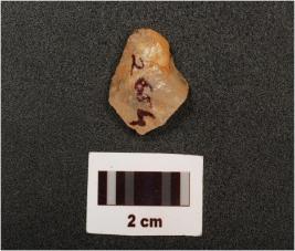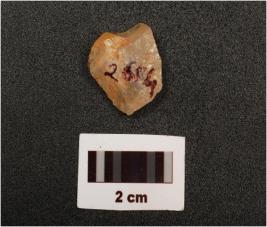 | Description / विवरण | Quartz flake with striking platform, diffused bulb on ventral side, broken along at distal end and use, wear marks on edges. |