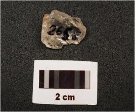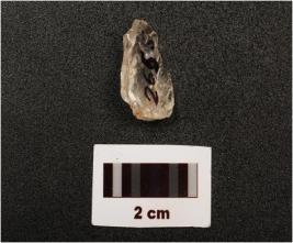 | Description / विवरण | Quartz end struck flake with striking platform, diffused bulb on ventral side, flake scars on dorsal side and use wear marks on one cutting edges. |