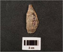 | Description / विवरण | A quartz flake with on improminent ridge on dorsal side, prepared platform, diffused bulb on ventral side and use wear marks on edges, |