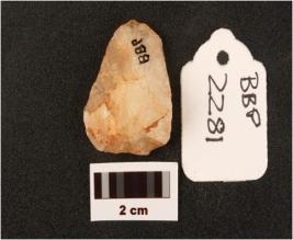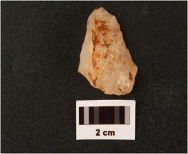 | Description / विवरण | Flake on quartz with use wear makrs along cutting edges prapared platform diffused b ulb on ventral side cortex visible on surface |