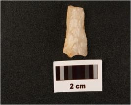 | Description / विवरण | Blade made on quartz with a mid ridge on dorsal side prepared platform use wear marks along cutting edges triangular in section one end is broken |