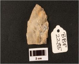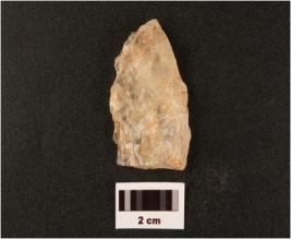 | Description / विवरण | Side scraper made on quartz with retouched and use wear marks along cutting edges diffused bulb triangular in section |