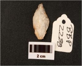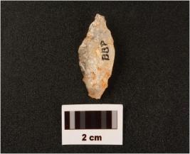 | Description / विवरण | Flake on quartz with use wear along cutting edge prapared platform prominent bulb on sorsal side smooth surface |