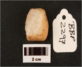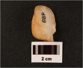 | Description / विवरण | Flake on quartz with use wear marks along cutting edges prepared platform diffused bulb on ventex side flake scars on dorsal side |