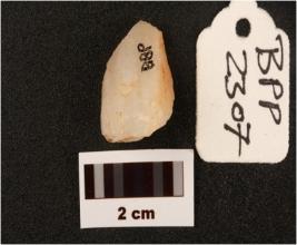 | Description / विवरण | Flake made on quartz with use-wear marks along cutting edges, perpared platform flake scars on dorsal side diffused bulb on ventez side triangular in section. |