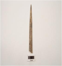 | Description / विवरण | A bone point with pointed ends cracks on surface, smooth and brown in colour and broken in its two pieces. |