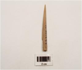 | Description / विवरण | A small bone point, with pointed end and brown in colour, cracks on surface and triangular cross section. |