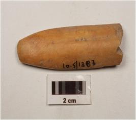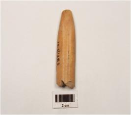 | Description / विवरण | A small bone point pointed one end, smooth surface, brown in colour, cracks are visible on surface and channeled on base. |