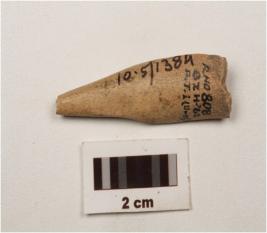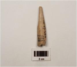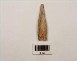 | Description / विवरण | A bone point with pointed ends, crack marks on surface, brown in colour and grooved base. |