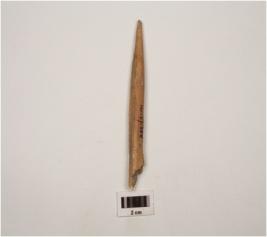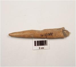 | Description / विवरण | A bone point with pointed end, glossy surface and brown in colour. |