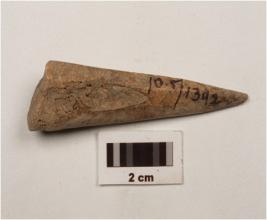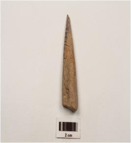 | Description / विवरण | A bone point with pointed end, rough surface and dark brown in colour. |