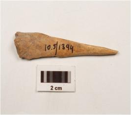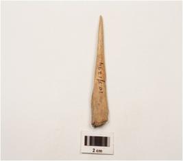 | Description / विवरण | A bone point with pointed ends, surface is smooth, brown in colour and grooved on bottom. |