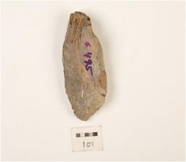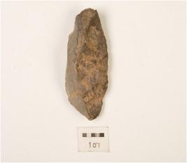 | Description / विवरण | Scraper made on chert, flake scars on the surface, partly retouching on the one cutting edge. |