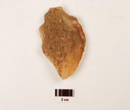 | Description / विवरण | A scraper made on chalcedony, ridge on dorsal surface, irregular cutting edges, difused bulb. |