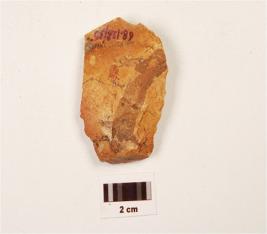 | Description / विवरण | A scraper made on chert end struck flake, ridge on dorsal surface, prominent bulb on ventral side, irregular cutting edges. |