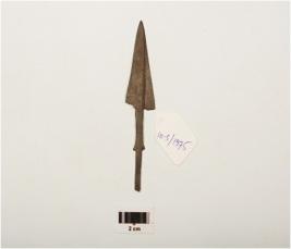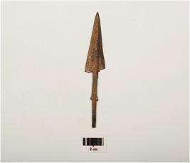 | Description / विवरण | Copper arrow head with tang, flat surface pointed top and slightly damage. |